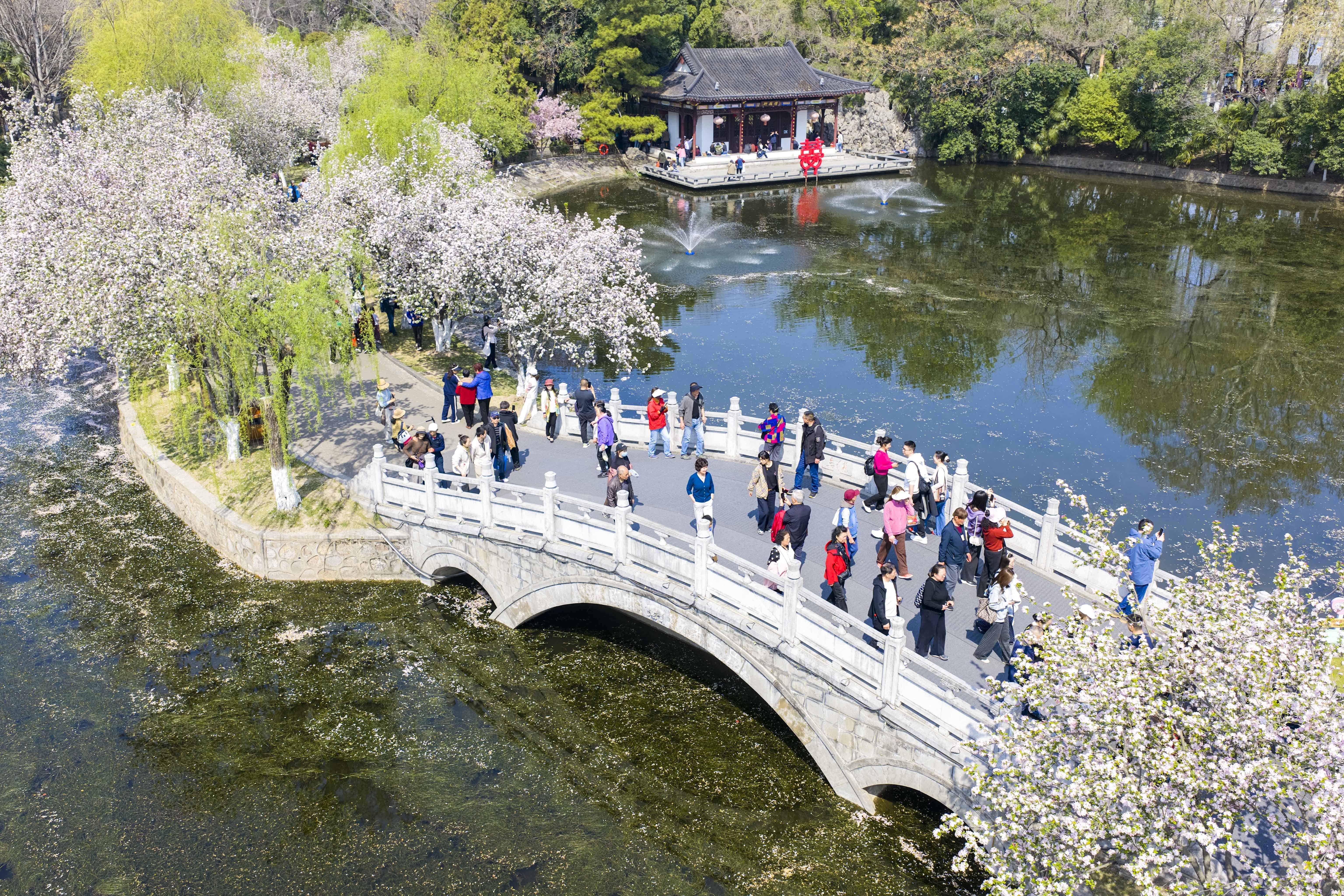 3月29日,游客在江苏南京莫愁湖公园赏花游玩(无人机照片)。新华社发(史俊 摄)顺应趋势,更好满足消费需求。江苏、河南等多地景区打造沉浸式演出,推出民俗非遗活动;多个消费品牌深挖文化底蕴,推出新中式茶饮、中医理疗等特色产品,国风酒店成为近郊游周边游首选。