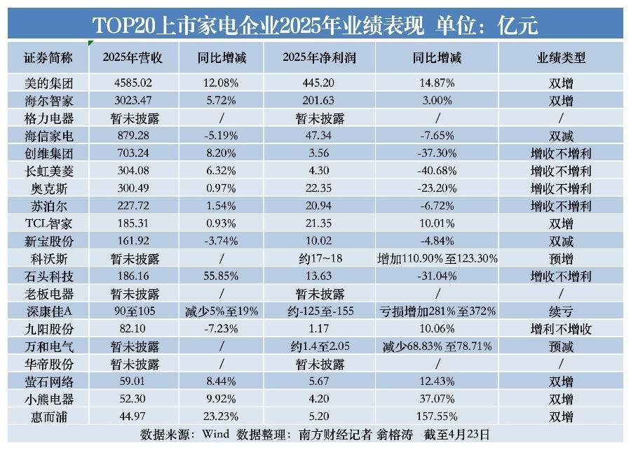 2025年家电财报季已经进入密集披露期,规模前20大家电上市公司绝大部分已经披露年报。南方财经记者梳理发现,在17家已经披露营收或利润数据的企业中,业绩双增的有6家,增收不增利的有5家,业绩双减的有4家。
